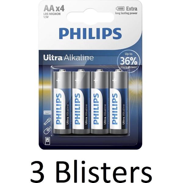 12 Stuks (3 Blisters a 4 st) Philips Ultra Alkaline AA Batterijen
