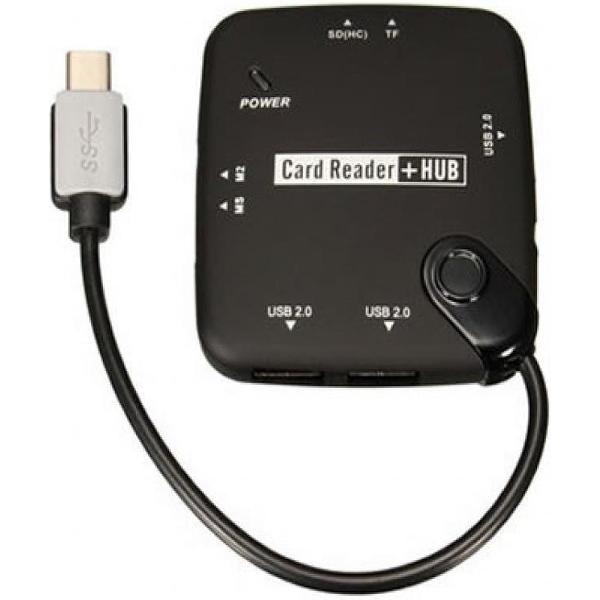 Multifunctionele OTG USB hub en card reader met geïntegreerdeUSB-C kabel waarmee u eenvoudig OTG compatibel smartphones en tablets aan kunt sluiten.