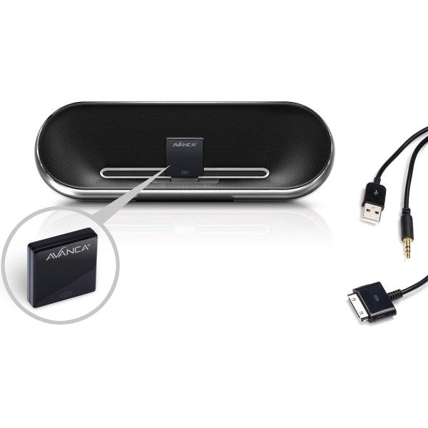 USB-kabel met split in AUX en 30-pin-stekker. Gebruik deze kabel om de Avanca DockR aan te sluiten op uw home stereo-installatie en geniet van uw favoriete muziek gestreamd vanaf een Bluetooth-apparaat naar uw stereoboxen. De USB-stekker stuurt stroom naar de Avanca DockR. Binnen enkele seconden verbindt u de AUX (line-out) aan uw stereo-installatie met AUX 3,5mm jack (line-in).