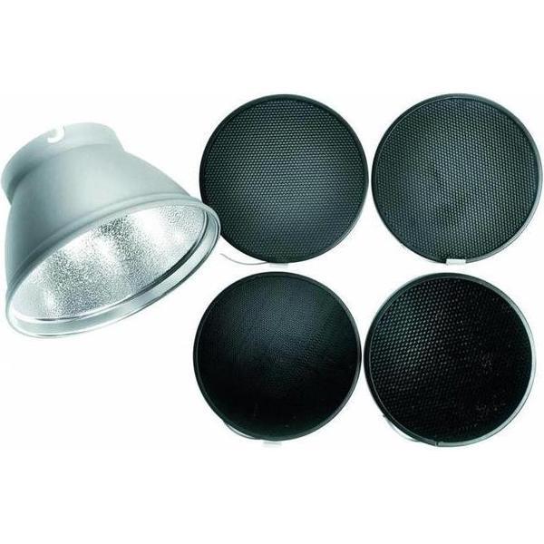 De reflector heeft zelf een lichthoek van 50° en is voorzien van een rand waarin de meegeleverde grids geplaatst kunnen worden. Hiermee is de lichthoek van 50° naar 8° aan te passen. Ideaal om effectief het licht op een specifiek punt te richten.
