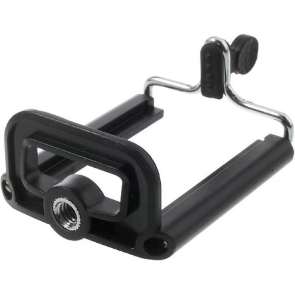 - Een universele telefoonhouder waarin je je telefoon in kan klemmen. Door de bevestigingsring aan de onderkant is het mogelijk om deze telefoonhouder te schroeven op een standaard tripod. Zo kan je met je telefoon de scherpste foto's maken of de mooiste filmpjes. De telefoonhouder is gemaakt van zwart kunststof en metaal. Deze telefoonhouder is geschikt voor telefoons die een schermbreedte hebben van tussen de 5 en de 8 cm.