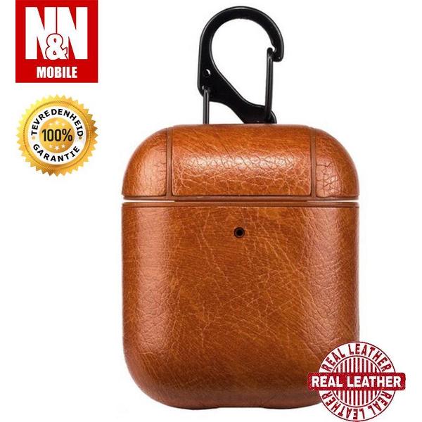 N&N Mobile Lederen Beschermhoes Case Voor Apple Airpods Met Haak - Lichtbruin - Superior Kwaliteit - Gegarandeerd Tevredenheid!