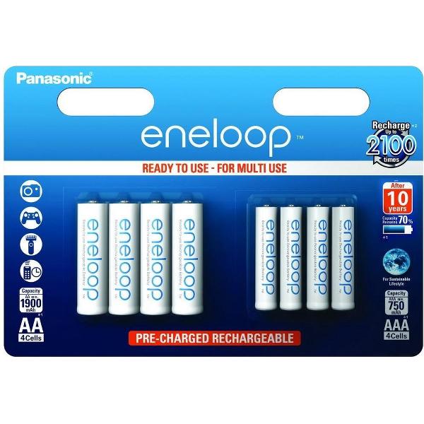 8x Panasonic eneloop AA/AAA 4+4 Oplaadbare Power-Packeneloop - Meer dan alleen een oplaadbare batterij * tot op 2100 keer op te laden * verminderde zelfontlading: 70% capaciteit na 5 jaar! * voorgeladen met zonne-energieSpecificaties AA: * Tot 2.100 laadcycli * Verminderde zelfontlading: 70% capaciteit na 5 jaar! * Panasonic eneloop BK-3MCCE/2BE * Type: NiMH * Formaat: AA / Mignon / HR6 / R6 * Type. capaciteit: 2000mAh * Min capaciteit:.. 1900mAh * Voltage: 1.2VSpecificaties AAA: * Tot 2.100 laadcycli * Verminderde zelfontlading: 70% capaciteit na 5 jaar! * Voorgeladen met zonne-energie * Type: NiMH * Size: AAA / Micro / R3 / (HR03) * 1.2V min 750mAh (Typ. Capacity 800mAh) * Panasonic Eneloop BK-4MCC * Made in JapanOmschrijving: * De Eneloop batterijen kunnen nu tot wel 2100 keer worden geladen en ontladen. Een jaar na het opladen is de batterij nog steeds tot 90% geladen; en na 5 jaar is de batterij nog tot 70% geladen. Dus ongeacht wanneer de batterij is opgeladen zelfs jaren later zijn de batterijen nog steeds geladen. Dit in tegenstelling tot de klassieke batterijen van bijvoorbeeld 2700 mAh die meestal in een paar weken leeg raken zeker als ze wat ouder zijn. * Eén van de belangrijkste kenmerken van de eneloop batterij is het hogere voltage ten opzichte van andere Ni-MH oplaadbare batterijen. Veel apparaten schakelen uit of geven een signaal dat een batterij leeg is als het voltage lager is dan 11 Volt. Een traditionele Ni-MH batterij zal gelijkmatig zijn spanning verliezen terwijl een eneloop batterij langdurig meer dan 11 Volt blijft afgeven en langer bruikbaar is. Dit zorgt ervoor dat een flitser sneller oplaadt bij gebruik van Eneloop batterijen in vergelijking met andere oplaadbare batterijen. En veel sneller dan bij gebruik van alkaline (wegwerp) batterijen. * Nog een voordeel van eneloop is de prestatie bij lage temperaturen. Zeker als het vriest presteert eneloop beter dan de concurrentie. * Eneloop batterijen kunnen geladen worden met een normale oplader die geschikt is voor Ni-MH batterijen.De Panasonic Eneloop Combipack 1x4 Mignon AA + 1x4 Micro AAA van NedRo is het ideale product om je fotografie naar een hoger niveau te tillen. Via FotografieVergelijk.nl kan je eenvoudig Panasonic Eneloop Combipack 1x4 Mignon AA + 1x4 Micro AAA bestellen bij de goedkoopste leverancier. Met een product van het merk NedRo verzeker je jezelf van goede kwaliteit.