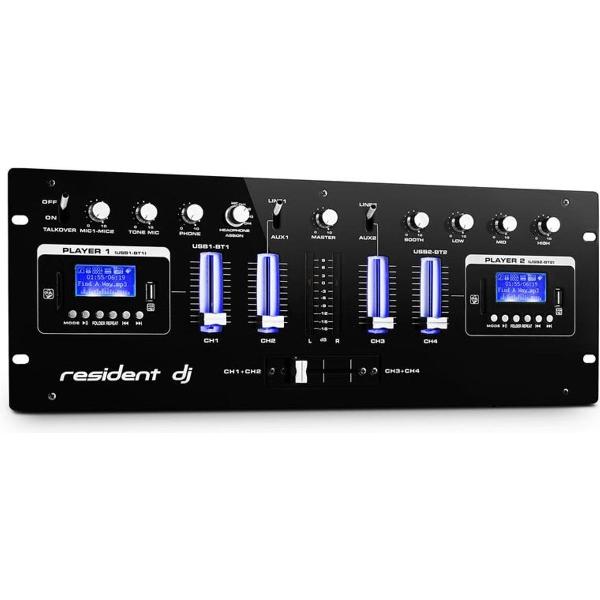 De resident dj DJ405USB is een hoogbegaafd 4-kanaals DJ-mengpaneel. Naast de enorme veelvoud van aansluitingen voor diverse apparaten is er een constructie geschikt voor rekinbouw en technische finesses zoals twee geïntegreerde Bluetooth-interfaces alsook twee voor MP3 geschikte USB-poorten en SD-slots.De Mixer biedt alle in- en uitgangsmogelijkheden om een ijzersterke DJ-setup op poten te zetten. Diverse audioapparaten zoals bijv. CD-spelers en versterkers vinden met aansluitingen in jackplug- en cinch-formaat de juiste plaats voor signaaloverdracht. Voor geluidsaanpassing staat een 3-bands equalizer ter beschiking.Een dubbele winstgevende bijzonderheid van de resident dj DJ405USB mixer zijn de gemakkelijk toegankelijke USB- en SD-slots, via welke MP3-titels vanaf USB-gegevensdragers en geheugenkaarten geraadpleegd kunnen worden. Als alternatief bieden de USB-poort en de SD-slots de optie het audiosignaal als WAV-bestand op te nemen. Separate knoppen en regelaars voor map- en titelnavigatie vergemakkelijken de besturing, terwijl de blauwe achtergrondverlichting van de kanaal-fader ook in donkere omgevingen een snelle bediening mogelijk maakt. Tot de bijzonderheden behoren echter de twee geïntegreerde Bluetooth-interfaces, die draadloze muziekweergave vanaf Smartphone, Tablet of Laptop mogelijk maken.Met twee microfooningangen inclusief individuele volumeregelaars, 2-bands equalizer en talkover-functie alsook piekvaste koptelefoonuitgang en cue-functie, biedt hij belangrijke features die voor DJ-toepassingen onmisbaar zijn.De metalen behuizing van het resident dj DJ405USB mengpaneel overtuigt door een solide afwerking en beschikt over hoogwaardige componenten zoals bijv. gripvaste aluminium draairegelaars, een hoog-glanzend bovenoppervlak en een soepel lopende crossfader. Voeten van rubber zorgen voor optimale grip en mixen zonder schudden.