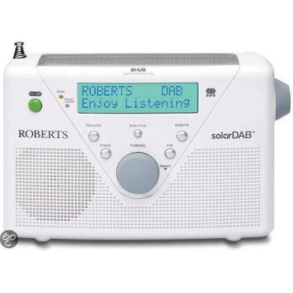 Roberts Radio introduceert met de solarDAB wel een heel bijzondere radio. Deze stijlvolle compacte FM/DAB radio is aan de bovenzijde voorzien van een zonnepaneel. Het paneel zet zonlicht direct om in stroom. De solarDAB wordt geleverd met oplaadbare batterijen. Eenmaal opgeladen, kunt u door het lage energieverbruik met een gerust hart tot wel 20 uur van uw radio genieten. Opladen kan door gebruik te maken van het lichtnet of de beschikbare zonneschijn. Door zijn beperkte afmetingen en goede ontvangst is de solarDAB perfect te gebruiken in tuinen, serres of tijdens het kamperen. Uiteraard doet hij het ook heel goed als tweede radio elders in het huis. Door de line-ingang is het ook mogelijk een mp3-speler of andere externe bron aan te sluiten. Met de solarDAB haalt u een veelzijdige radio in huis!De Roberts SolarDAB Wit van Roberts Radio is het ideale product om je fotografie naar een hoger niveau te tillen. Via FotografieVergelijk.nl kan je eenvoudig Roberts SolarDAB Wit bestellen bij de goedkoopste leverancier. Met een product van het merk Roberts Radio verzeker je jezelf van goede kwaliteit.
