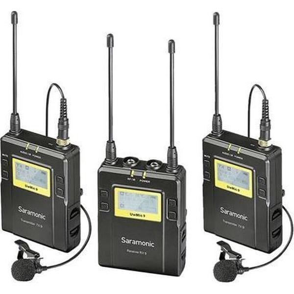 De Lavalier Microfoon Set UwMic9 TX9 + TX9 + RX9 UHF draadloos van Saramonic is een combinatie van zender en ontvanger, welke onderdeel zijn van het UwMic9 systeem. De twee TX9 zenders en de tweekanaals RX9 ontvanger zijn eenvoudig met elkaar te koppelen, door de ingebouwde infraroodmodule, via een automatische scan of handmatig. Bij elk van de twee TX9 zenders wordt een lavaliermicrofoon geleverd, ook wel dasspeldmicrofoon genoemd. U bevestigt de microfoon met de robuuste klem eenvoudig aan de stropdas of het overhemd van de persoon die wordt geïnterviewd. De bijbehorende TX9 zender kan aan de broekzak worden bevestigd, met één van de meegeleverde bevestigingsbeugels. De persoon kan nu vrij bewegen en heeft geen last van een kabel die naar de camera loopt.