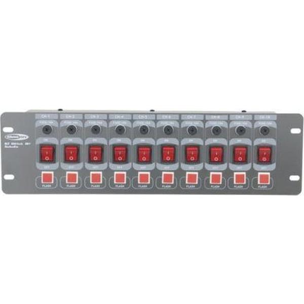 Schakel je lichteffecten of apparatuur simpel en snel met deze ShowTec DJ-Switch 10F. Een 10-kanaals switchpanel / schakelpaneel met flashtoetsen. Deze flashfunctie zorgt ervoor dat je je lichten (of andere aangesloten apparatuur) even snel en kortstondig aan kan zetten. Het paneel is voorzien van shuko aansluitingen (gewone netstekkers) en verlichte schakelaars. De maximale belasting per kanaal is 10A, de totale maximale belasting van het paneel is 15A. Zekeringhouders zitten op de voorkant dus eventuele gesprongen zekeringen kunnen snel en eenvoudig vervangen worden.