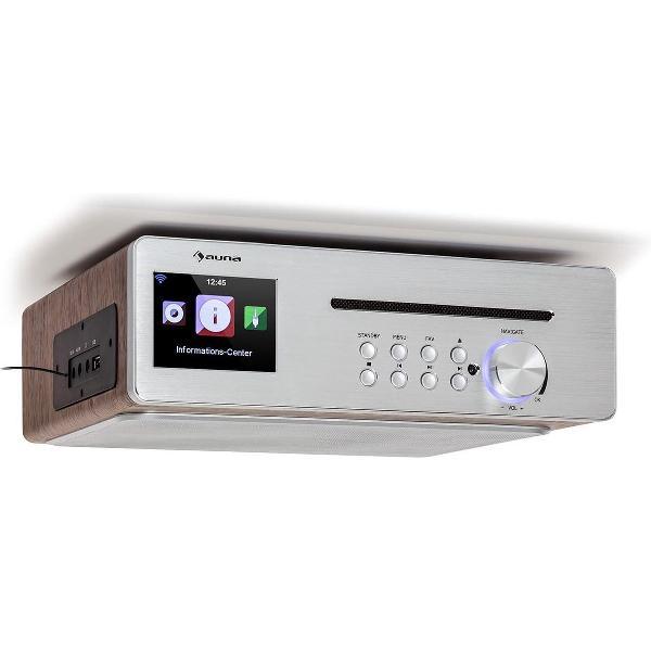 De Silverstar Chef keukenradio van auna verbindt bijzonder moderne techniek met een ruimtebesparend en stijlvol design.Een internet-, een DAB+ en een FM-radiotuner bieden toegang tot talloze radiozenders - van lokale stations tot de zenders die wereldwij gezien ver weg liggen. Dankzij de 2,4 TFT kleurendisplay met hoge resolutie en HCC Display-technologie houd je bij het luisteren steeds de tijd, de radiozender, titel- en weersinformatie in het oog. Via de Bluetooth aansluitmogelijkheid kan op eenvoudige wijze muziek van de smartphone, tablet of pc worden gestreamd en via de neerwaartse luidspreker worden weergegeven. De ingebouwde cd-speler speelt de gangbare formaten af en imponeert door zijn eenvoudige bediening. De Silverstar Chef keukenradio kan worden bediend met een vermogen van 10 watt RMS en max. 20 watt direct aan het apparaat of comfortabel van afstand via de Air Music Control-app. Een zijwaarts aangebrachte USB-poort en een AUX-ingang breiden de muziekweergave uit door de eenvoudige aansluiting voor externe apparaten. De onderbouwradio overtuigt bovendien met een sleeptimer en een wekfunctie en kan - zoals de naam al verraadt - eenvoudig en ruimtebesparend onder keukenkastjes en keukenkasten worden aangebracht. Een voorzijde van geborsteld roestvrijstaal en een behuizing in decente hout-look bezorgen het apparaat een stijlvol en charmant voorkomen.Een enorme keuze uit radiozenders, een smart en ruimtebesparend design en vele weergavemogelijkheden maken van de auna Silverstar Chef een ideale keukenpartner.De Silverstar Chef keukenradio 20W max. CD BT USB internet/DAB+/FM zilver van Auna is het ideale product om je fotografie naar een hoger niveau te tillen. Via FotografieVergelijk.nl kan je eenvoudig Silverstar Chef keukenradio 20W max. CD BT USB internet/DAB+/FM zilver bestellen bij de goedkoopste leverancier. Met een product van het merk Auna verzeker je jezelf van goede kwaliteit.