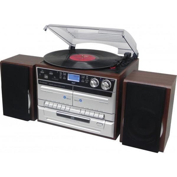 Met het Soundmaster MCD5550DBR muziek center kunt u uw oude platen weer van zolder halen of een nieuwe platencollectie gaan verzamelen. Uw platen zijn te draaien op 33 1/3, 45 of 78 toeren. Deze innovatieve muziek center kan tevens uw platen en CD's digitaliseren naar MP3 formaat en wegschrijven naar USB-stick of SD-kaart. Dankzij de twee meegeleverde luidsprekers heeft u geen extra versterker nodig om uw platencollectie te kunnen beluisteren. Naast de platenspeler is dit music center ook uitgerust met DAB+ radio, bluetooth connectiviteit, dubbele cassettedeck en een CD-speler. De bediening gaat gemakkelijk met bijgeleverde afstandsbediening. De Soundmaster MCD5550 DBR met een LCD display met klok, alarm en sleepfunctie is net wat luxer uitgevoerd dan je wellicht van dit nostalgische apparaat zou verwachten.