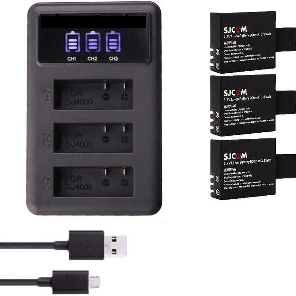 Deze set bestaat uit 3 SJCAM batterijen van ieder 900mAh en een triple lader incl. USB kabel.