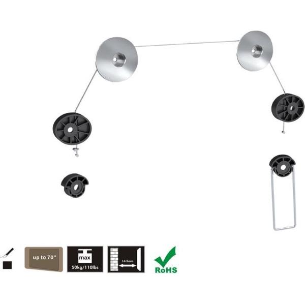 Hiermee hang je eenvoudig schermen t/m 70 inch aan de wand. Montage is een fluitje van een cent; je monteert twee metalen rozetten aan de wand. Vervolgens hang je je scherm met behulp van een hoogwaardige staalkabel over de metalen rozetten en kun je optimaal genieten van je flatscreen-tv!