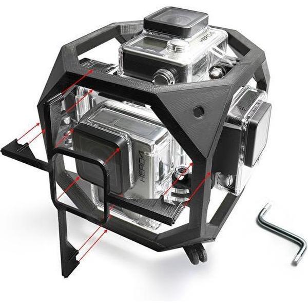 Deze set bestaat uit: * 1 x 360° Spherical Panorama Mount 6Cams * 6 x Imbusschroeven (draad lengte 20mm) * 6 x M5 moeren * 1 x Inbussleutel De 360 ° Spherical Panorama Mount is geschikt voor 6 GoPro camera's zowel met de waterdichte behuizing, alsook met de optioneel verkrijgbare Frame Mount voor het verminderen van gewicht. Hierdoor kunt u unieke sferische panoramische video's en 360 ° foto's te schieten.Met een gewicht van slechts 135 gram (zonder camera's) zijn de gebruiksmogelijkheden bijna eindeloos.De geïntegreerde 1/4-inch draad maakt een eenvoudige bevestiging van uw mount op een gewoon statief of telescopische stang mogelijk.Het synchroniseren van de GoPro's is eenvoudig door het gebruiken van een GoPro Smart-Remote. De afzonderlijke video kan samengevoegd worden met een verscheidenheid aan software. (Wij raden Autopano Video)Er dient rekening gehouden te worden dat onderwaterbeelden lastig aan elkaar te naaien zijn dit vanwege de beperkte gezichtsveld in water.Deze 360° Spherical Panorama Mount werkt prima met de GoPro Hero5 Materiaal: Deze mount is vervaardigd met een 3D-printer en op basis van polymelkzuur (PLA), afkomstig uit hernieuwbare bronnen. De zeshoekige moeren en de bouten zijn gemaakt van roestvrij staal voor maximale bescherming tegen corrosie. Wilt u een COMPLETE set kopen inclusief camera's en geheugenkaarten, dan kunt u met ons contact opnemen voor de mogelijkheden.De 360 Rig voor Hero5 & Hero6 - Degree Spherical Panorama Mount 6 Cams van ActieCamera.eu is het ideale product om je fotografie naar een hoger niveau te tillen. Via FotografieVergelijk.nl kan je eenvoudig 360 Rig voor Hero5 & Hero6 - Degree Spherical Panorama Mount 6 Cams bestellen bij de goedkoopste leverancier. Met een product van het merk ActieCamera.eu verzeker je jezelf van goede kwaliteit.