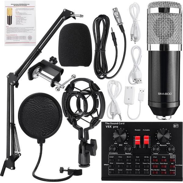Condensator Microfoon Kit Pro Audio Studio Geluidsopname Microfoon met V8X PRO Muti-functionele Bluetooth Geluidskaart - Podcast-Streaming-Gaming-Game streamen zwart zilver