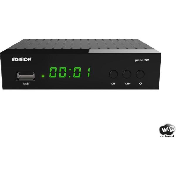 Edision Picco S2 DVB-S2 FTA Satelliet - TV ontvanger De Edision Picco S2 Satelliet ontvanger is uitgerust met een HDMI ingang Full HD 1080 naast de HDMI heeft deze TV-Ontvanger ook een scart aansluiting voor oude televisies .De Picco DVBS-2 heeft aan de voor zijden een display waarbij je de kanaalnummer kun aflezen en bevind ook knoppen waar je de TV-Ontvanger mee kunt bedienen Aan de zijkant bevind zich een aansluiting voor een IR verbinding zo dat je deze ontvanger kunt wegwerken in de kast of achter de tv. De TV ontvanger werkt op 12 volt en makkelijk te gebruiken op een camper,caravan of op een boot Het hoogtepunt is de reeds geïntegreerde WLAN-module voor internettoepassingen zoals YouTube, WebTV, RSS-nieuws en weersvoorspelling.