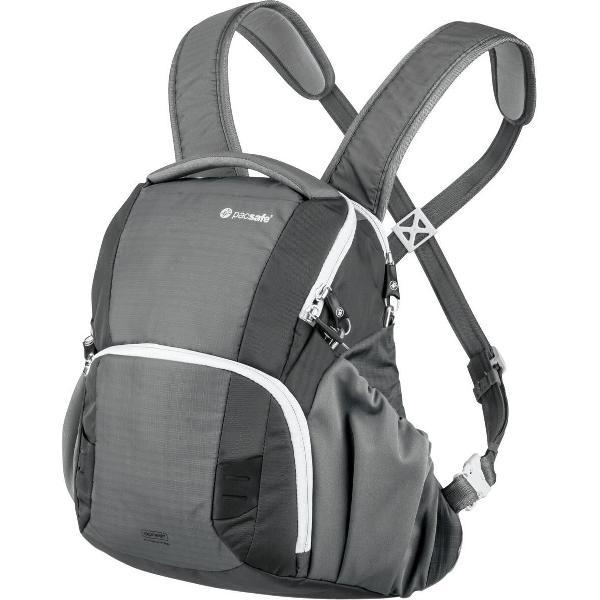 Pacsafe Camsafe V11 camera front packKeep your DLSR or mirrorless (micro 4/3) camera gear extra secure in crowded busy situations with the Camsafe�� V11. The anti-theft front pack can be worn 4 different ways - on the front or as a backpack - and has been designed to keep expensive gear travel essentials and priceless photos safe from blink-and-you'll-miss-them pickpockets. What's more the front pack design and quick access pocket means you'll be able to point and shoot at lightning speed.Unique Features * Fits small to mid-sized DSLR cameras (e.g. up to Canon 600D) or mirrorless compact system cameras with standard mounted lenses and extra lens * Drawstring inner divider opens into 1 large 10L compartment * Can be worn as a front pack or backpack * Rear iPad�� / tablet compatible pocket * Adjustable shoulder straps * Comfortable EVA molded back support with air flow channels * 2 side stretch pockets * Removable padded camera compartment with padded / modular Velcro�� divider(s) * Camera compartment has zippered lid and soft brushed polyester lining * Hideaway rain cover built-in * Pocket for Smartphone * Easy access front compartment with organisation for phone / SD cards and small items * Key / wallet fastener * Pen holder * RFID-blocking pocket for passport or credit cardsAnti-theft Features * eXomesh�� slashguards * Carrysafe�� slashguard strap * Smart zipper security * Dual release security buckle * RFIDsafe(TM) blocking pocketSpecifications * Materials: (outer material) 210D Nylon 3-line ripstop PU1000mm / 400D Nylon oxford PU1000mm (lining) 200D polyester PU1000mm polyester fleece high density PE foam * Dimensions (H x W x D): 34 x 31 x 14 cm / 13.4 x 12.2 x 5.5 in * Weight: 900 g / 1 lbs 15.7 oz * Volume: 11.5 L / 702 cubic inDe Pacsafe Camsafe V11 fronttas Grey van Pacsafe is het ideale product om je fotografie naar een hoger niveau te tillen. Via FotografieVergelijk.nl kan je eenvoudig Pacsafe Camsafe V11 fronttas Grey bestellen bij de goedkoopste leverancier. Met een product van het merk Pacsafe verzeker je jezelf van goede kwaliteit.