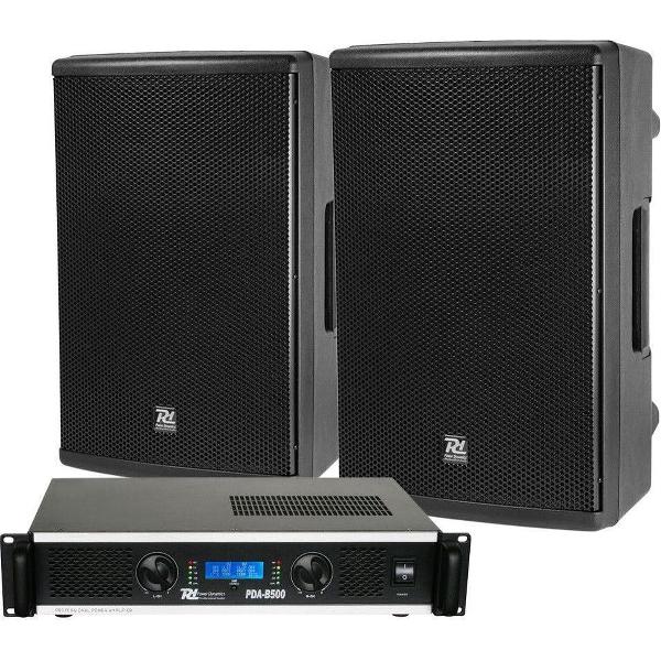 Power Dynamics complete geluidsinstallatie met PD412P speakers en PDA-B500 versterker