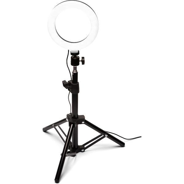 LED ring licht, verstelbare tripod, USB kabel met controller.