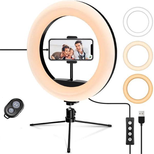 De ringlamp is beschikbaar met tafelstatief of een langer statief. Daarnaast heeft de ringlamp een handige houder voor je telefoon.